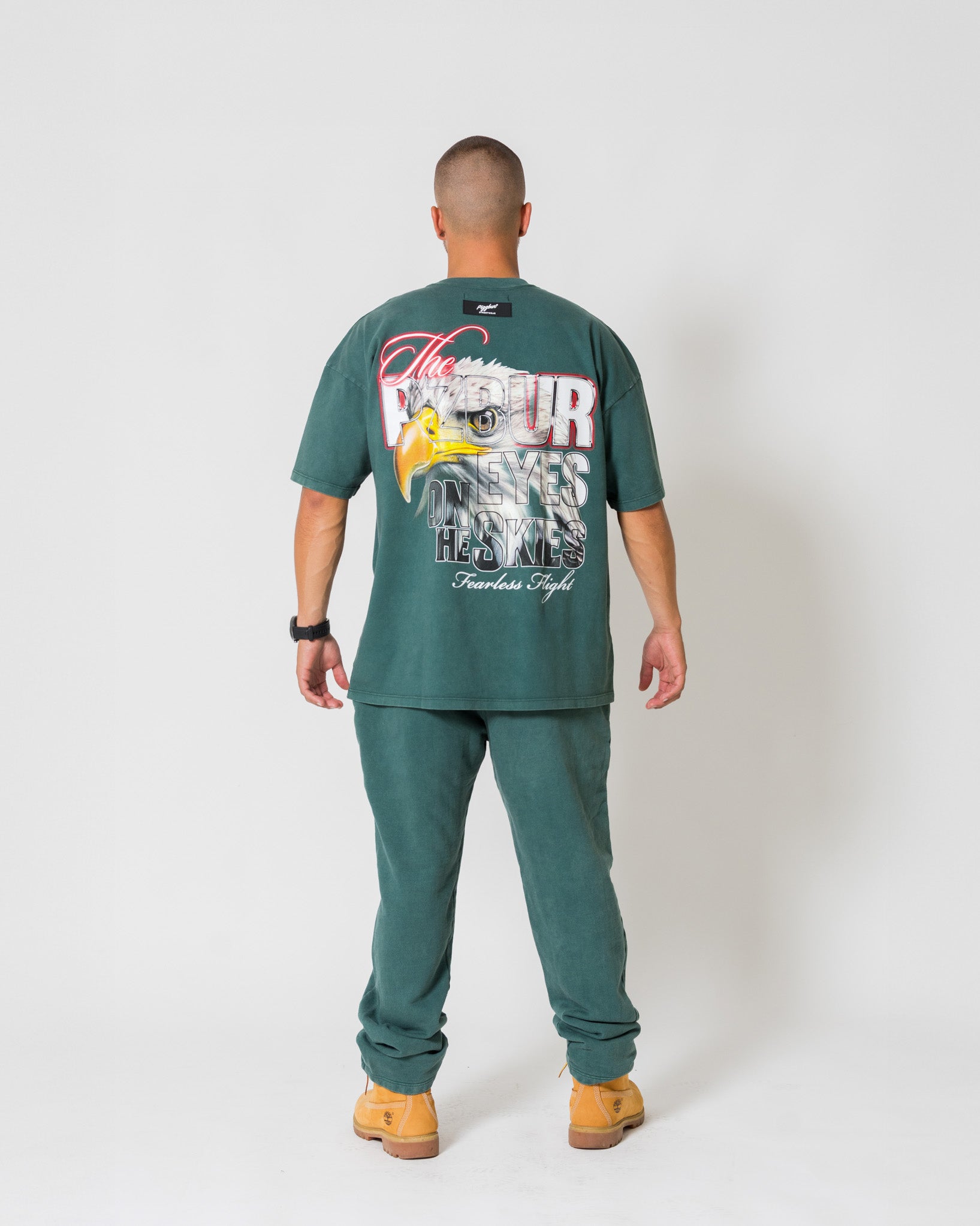 Camiseta color pine green acid wash de molde oversized, elaborada en tela 100 % algodón de alto gramaje (250g), intervenida con estampado gráfico en policromía en espalda y en frente punto corazón logos en semi alta densidad.