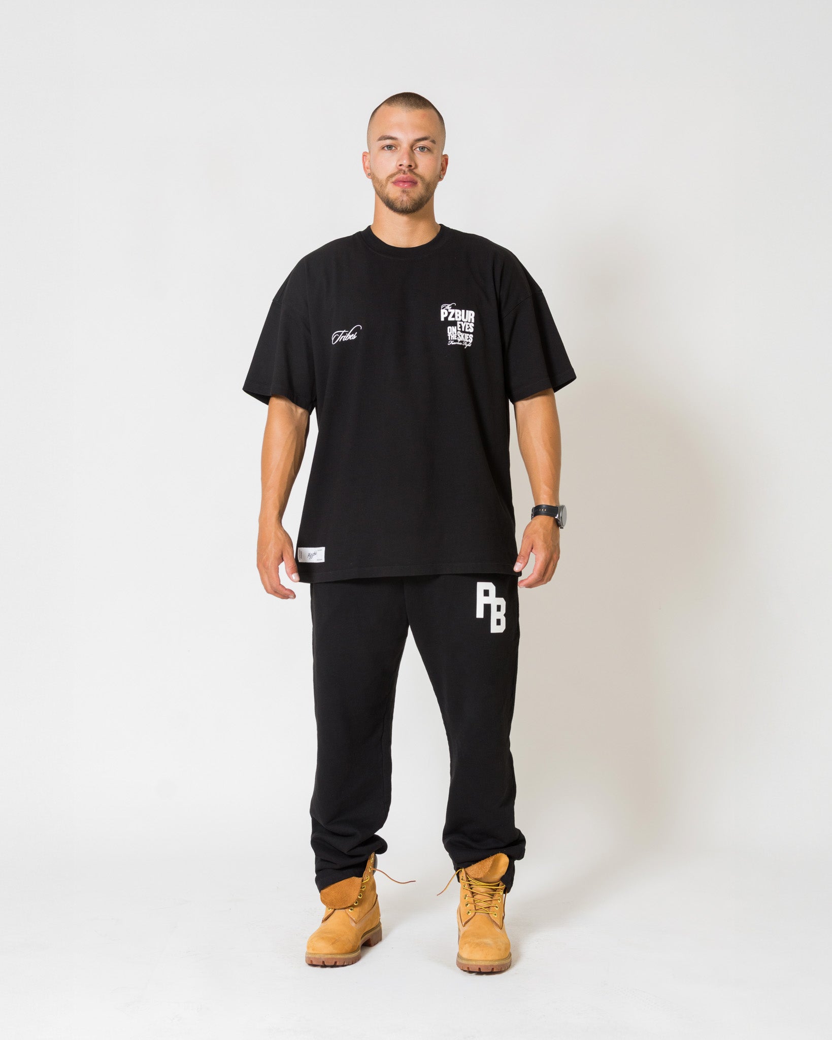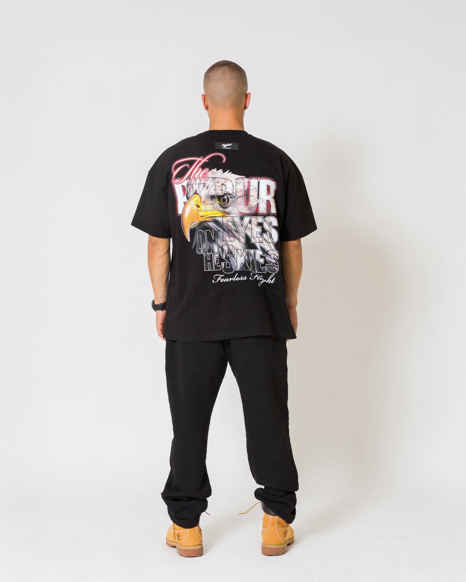 Camiseta color negro de molde oversized, elaborada en tela 100 % algodón de alto gramaje (250g), intervenida con estampado gráfico en policromía en espalda y en frente punto corazón logos en semi alta densidad.