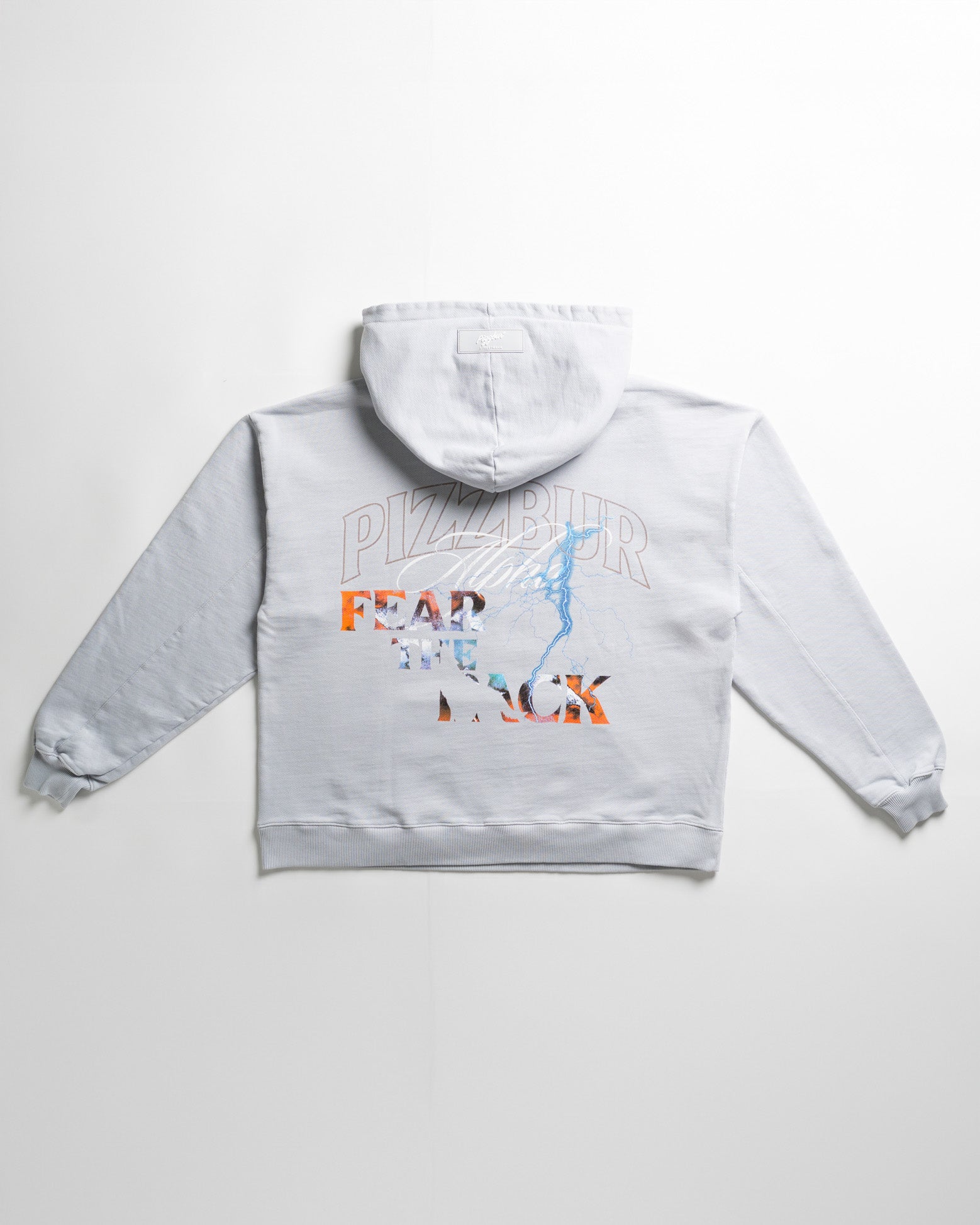 Buzo gris azulado de molde oversized, elaborado en tela burda 100 % algodón de alto gramaje (400g), intervenido con estampado gráfico en policromía en frente y espalda.
