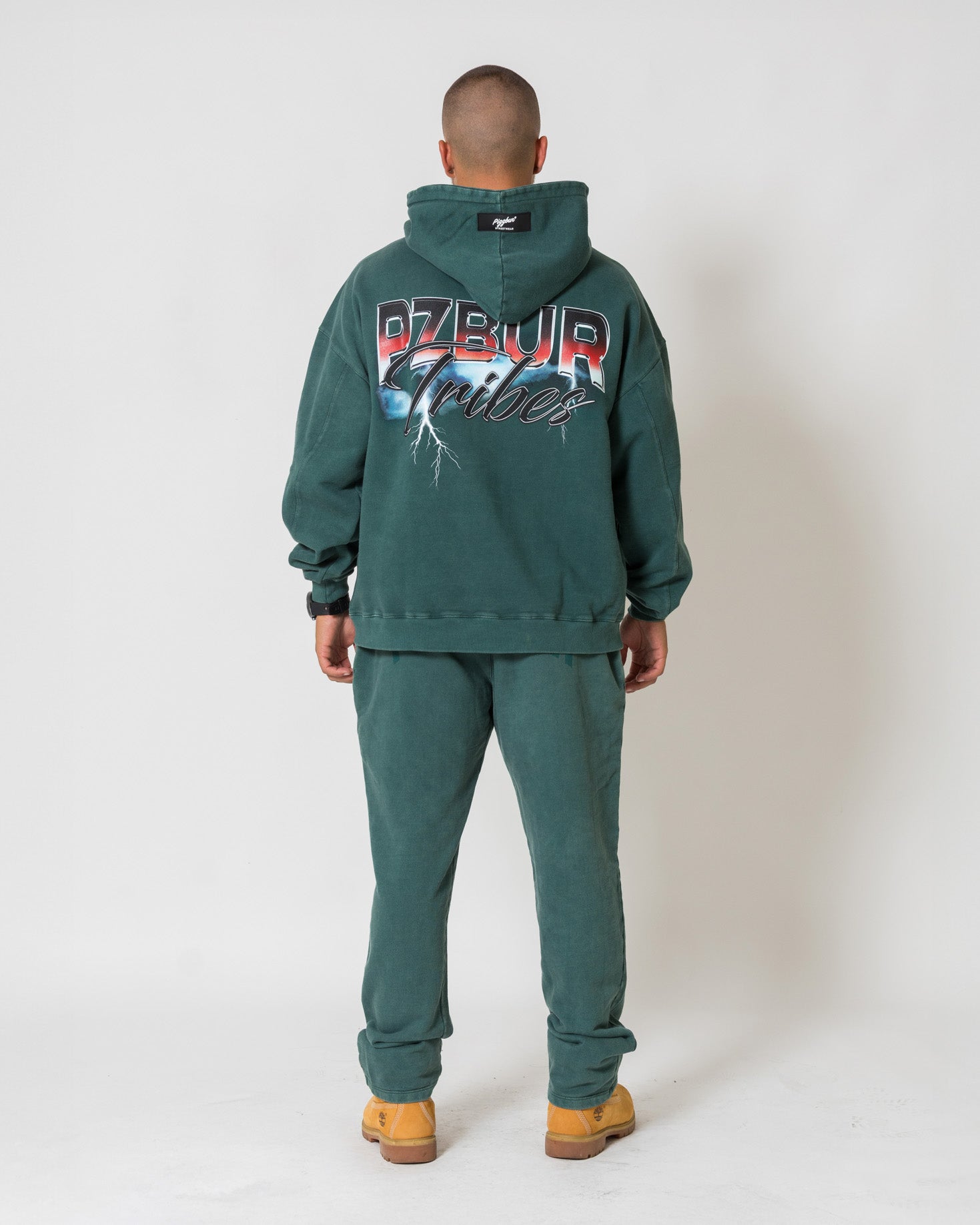 Buzo color pine green acid wash de molde oversized, elaborado en tela burda 100 % algodón de alto gramaje (400g), intervenido con estampado gráfico en policromía en frente y espalda.