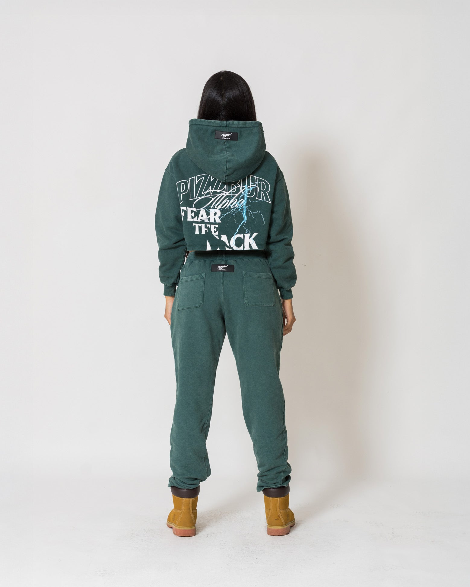 Jogger color pine green acid wash de molde oversized, elaborado en tela burda 100 % algodón de alto gramaje (400g), intervenido con estampado en semi alta densidad blanco pierna izquierda debajo del bolsillo.