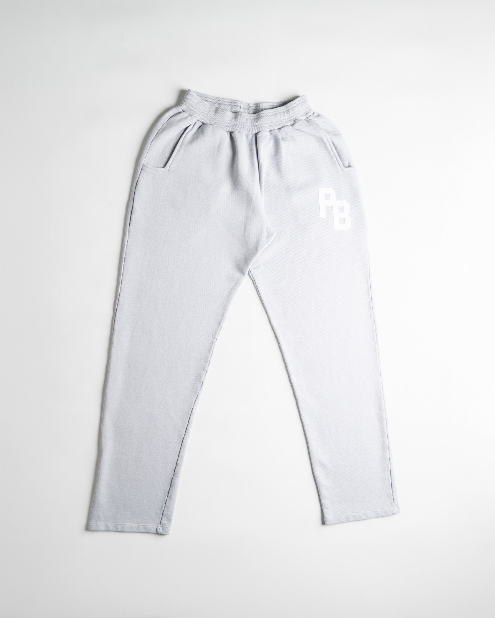 Jogger color gris azulado de molde oversized, elaborado en tela burda 100 % algodón de alto gramaje (400g), intervenido con estampado en semi alta densidad blanco pierna izquierda debajo del bolsillo y estampado textil tono a tono parte posterior.